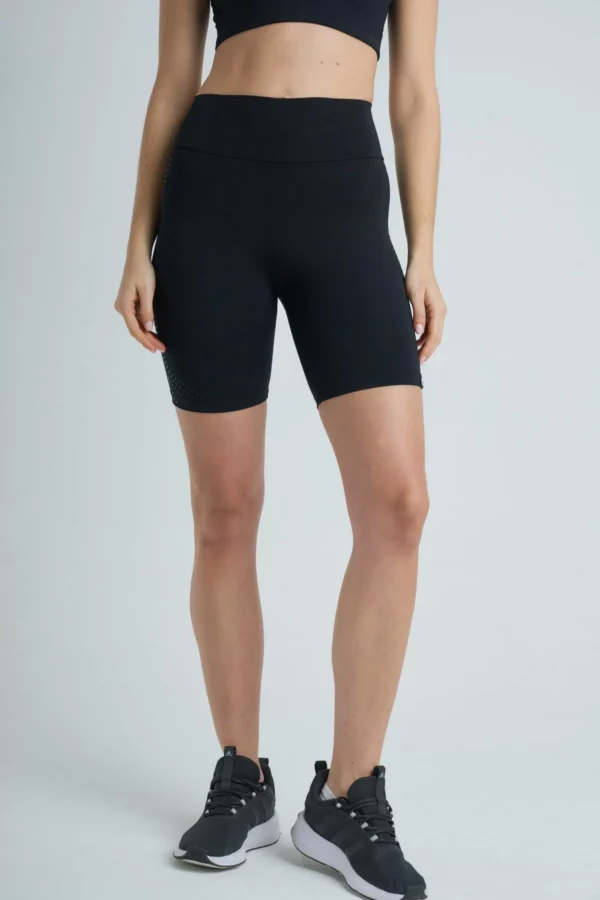Ciclista deportiva confeccionada en microfibra suave y liviana, con calce cómodo que se adapta al movimiento. Presenta un diseño de estampa localizada asimétrica en laterales y parte trasera, pensado para estilizar y realzar la figura.